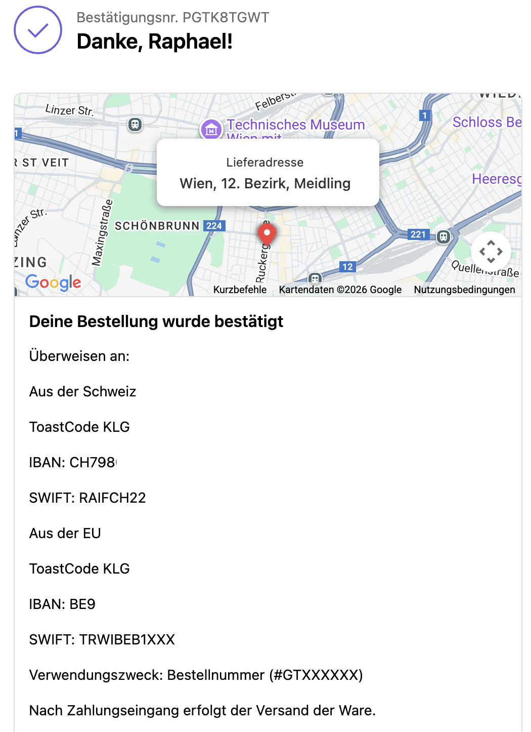 Auf der Danke-Seite findet man dann den Text zur Zahlungsanweisung. Leider wird der nicht so formatiert wie es in den Einstellungen dargestellt wird, aber das ist halb so schlimm.