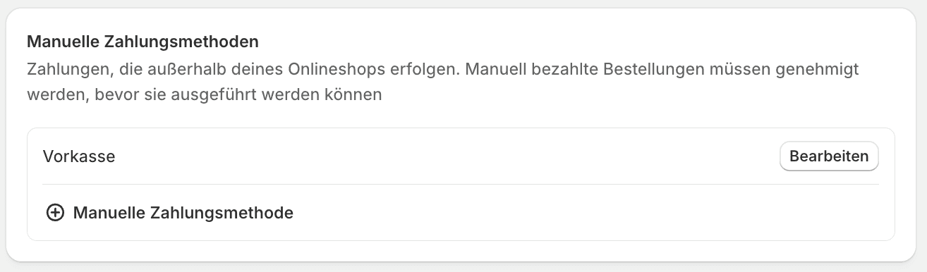 Um deinen Kunden im Checkout Vorkasse als Zahlungsoption anbieten zu können, müssen Sie sie zuerst in den Einstellung einrichten. Über Einstellungen → Zahlungen finden Sie den Bereich manuelle Zahlungsmethoden.