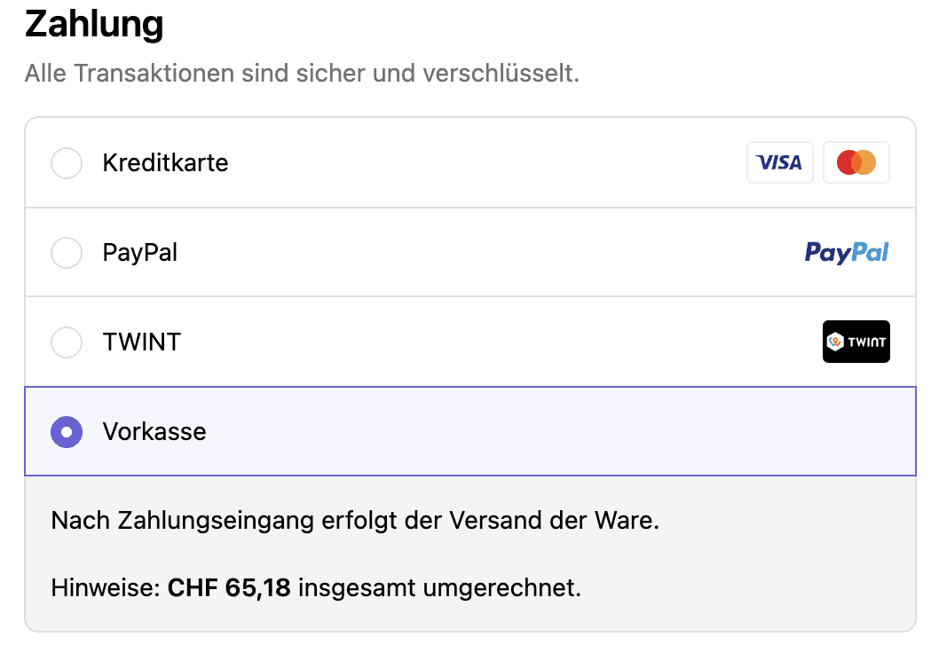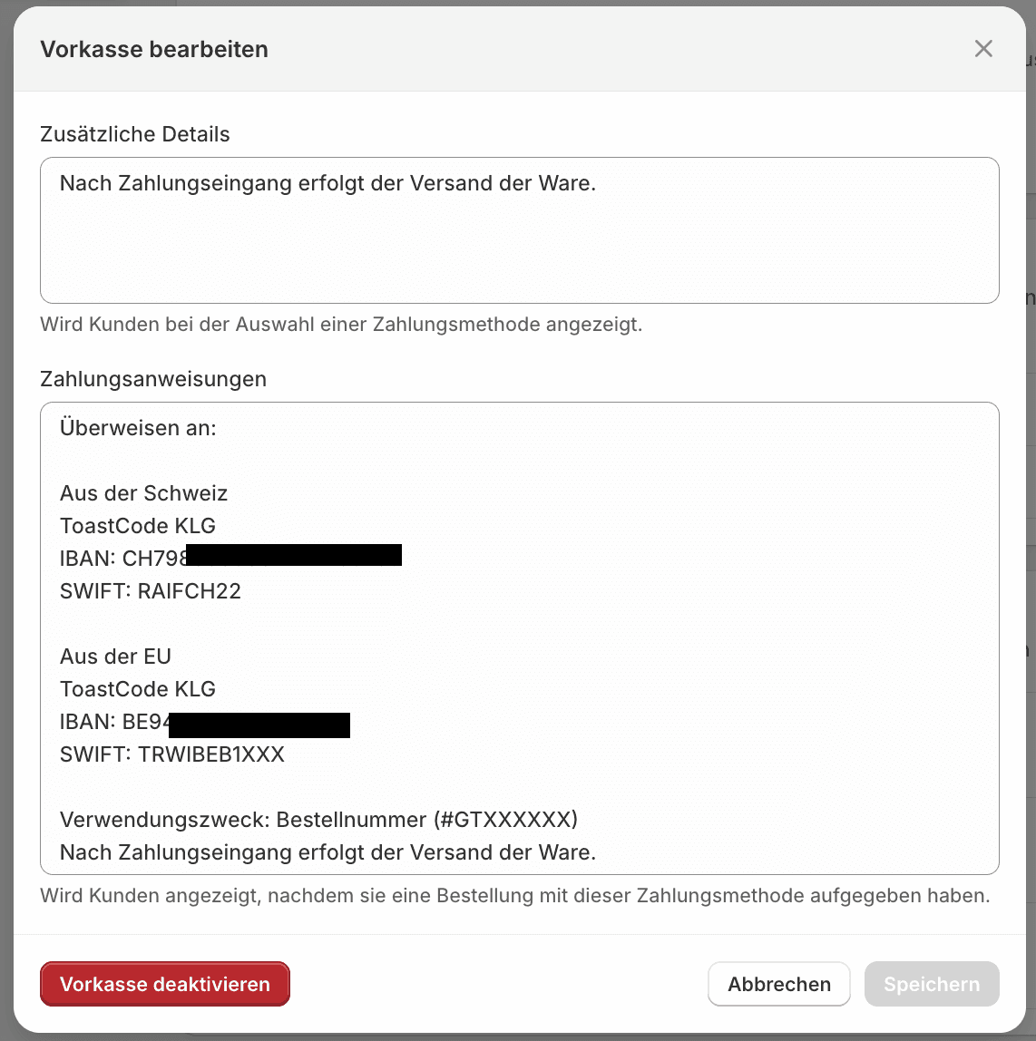 Zusätzliche Details: Wird dem Kunden im Checkout bei Auswahl von Vorkasse als Zahlungsmethode angezeigt.